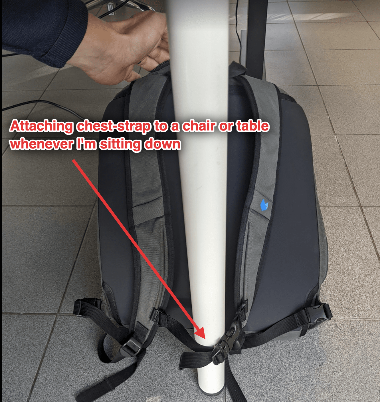 I clip my backpack's chest strap to a chair or table to ensure it can't be easily snatched. It saved my bag once.