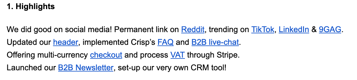 - Communicate differently, not less. We treat Slack like an answering machine; we ask questions without expecting immediate answers. Each week, I share written updates with the team. Each month, I share a summary of what has happened: